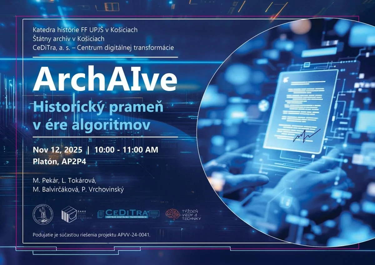 Katedra histórie Filozofickej fakulty UPJŠ v Košiciach, Štátny archív v Košiciach a CeDiTra, a. s. – Centrum digitálnej transformácie pozývajú na odbornú prednášku s názvom „ArchAIve: Historický prameň v ére algoritmov“, ktorá sa uskutoční v stredu 12. novembra 2025 o 10:00 hod. v miestnosti AP2P4 v budove Platón v areáli FF UPJŠ na Moyzesovej 9 v Košiciach.